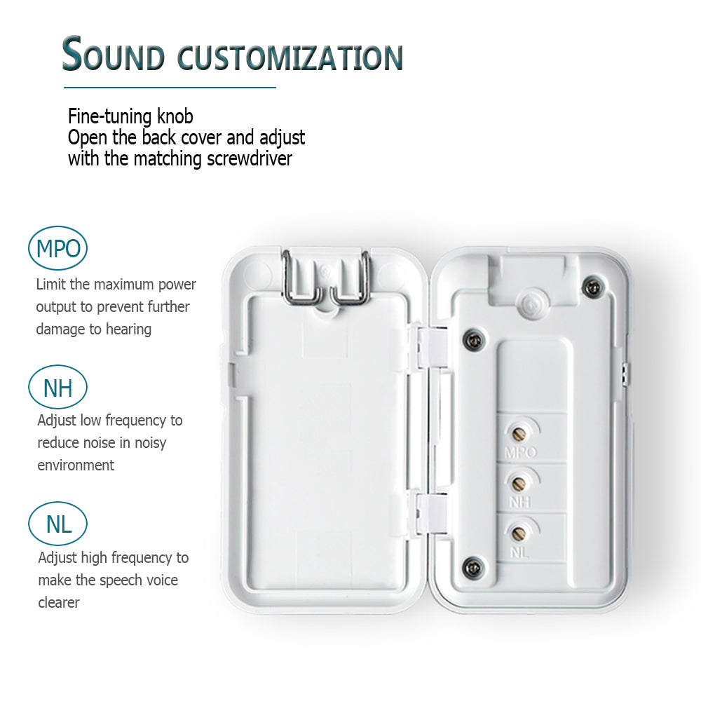 -Concealed Fine tuning keys.Open the back cover of the hearing aid, and there are three fine tuning joints that can be adjusted with the included gadget.
